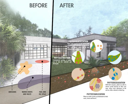 adaptive re-use of a contributing structure in the barrio latino national historic district that proposed using phytoremediation to remove toxins the site from decades of use as a motor vehicle service station